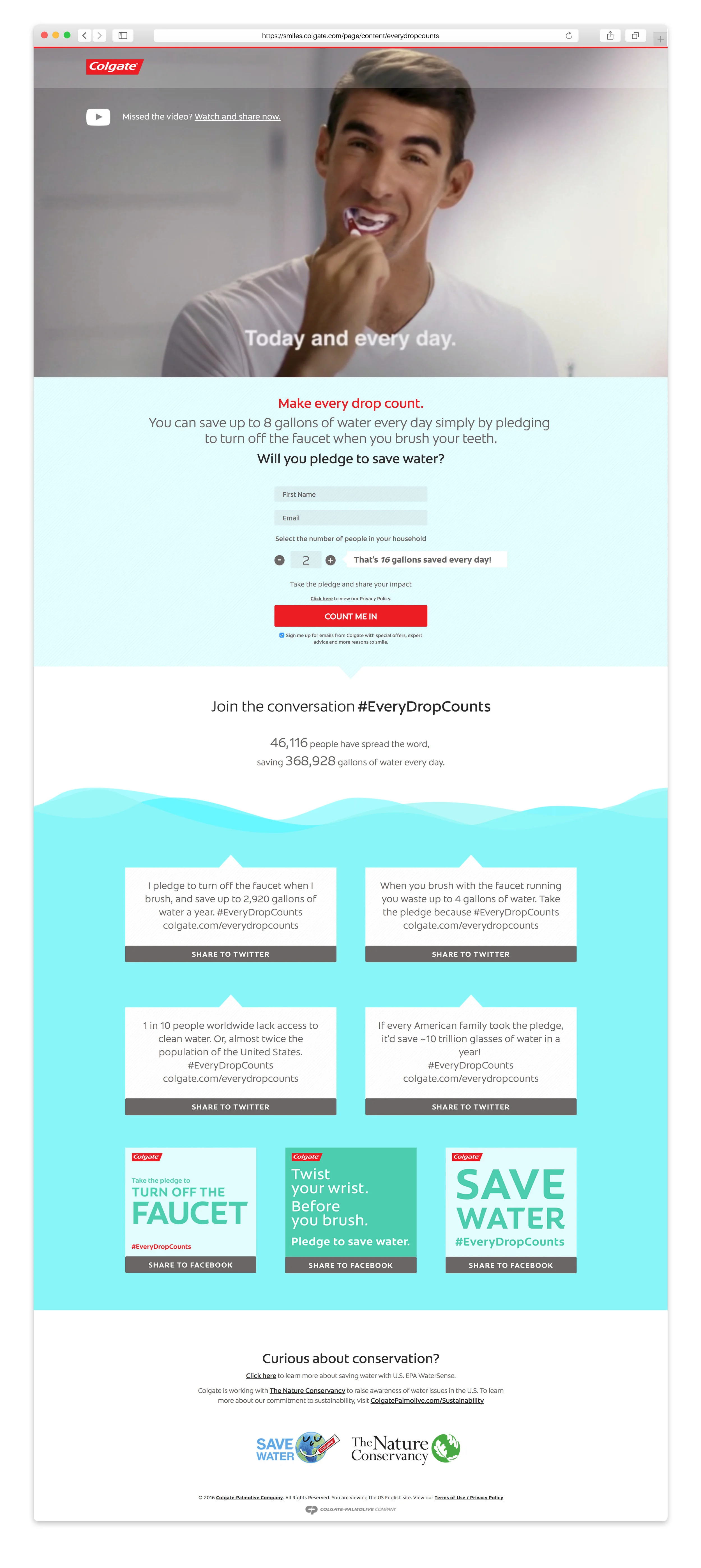 Colgate realized something: when most people brush their teeth, they leave the faucet running. Leaving the water running while brushing wastes up to 4 gallons of water every time (enough water to fuel you for 8 SoulCycle classes), and as an oral care brand we knew it was our responsibility to spread a message of conservation.